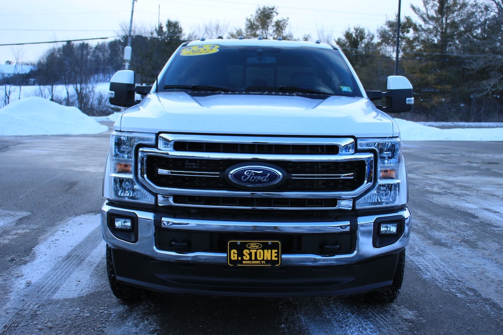 This is a 2022 Ford F-350 Lariat Crew Cab. This pickup truck is a 4X4 and powered by an aggressive 7.3L gas engine with 64K miles. This is in good condition, is well maintained and comfortably loaded with power leather heated and cooled bucket seats, power windows and locks, cruise, tilt, upfitter switches, snow plow prep, tailgate step spray in bedliner and more. Give us a call for more information. At G. Stone Motor's we take anything in trade.