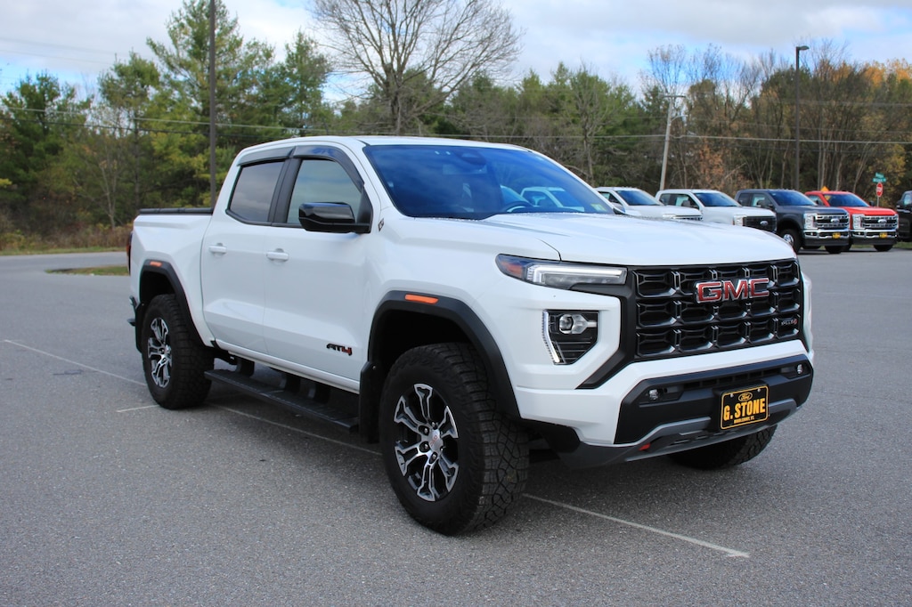 This is a 2024 GMC Canyon AT4 Crew Cab. This pickup truck is 4WD and powered by an aggressive 2.7L Turbomax engine with 10K miles. This is in good condition, is well maintained and comfortably loaded with power leather heated bucket seats, power windows and locks, cruise, tilt, rear view camera, remote start, sliding rear window, lane keeping and more. Give us a call for more information. At G. Stone Motors we take anything in trade!